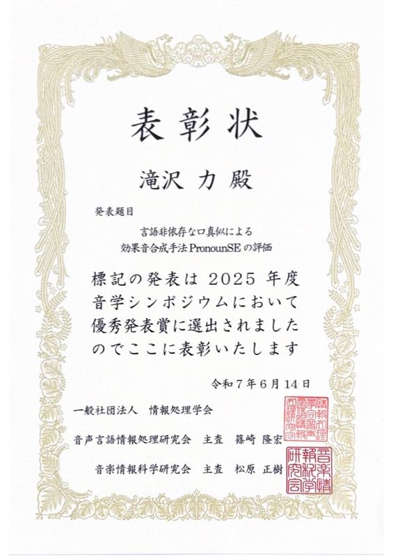 - 音学シンポジウム2025での研究発表と受賞(2025年6月13日〜14日)
